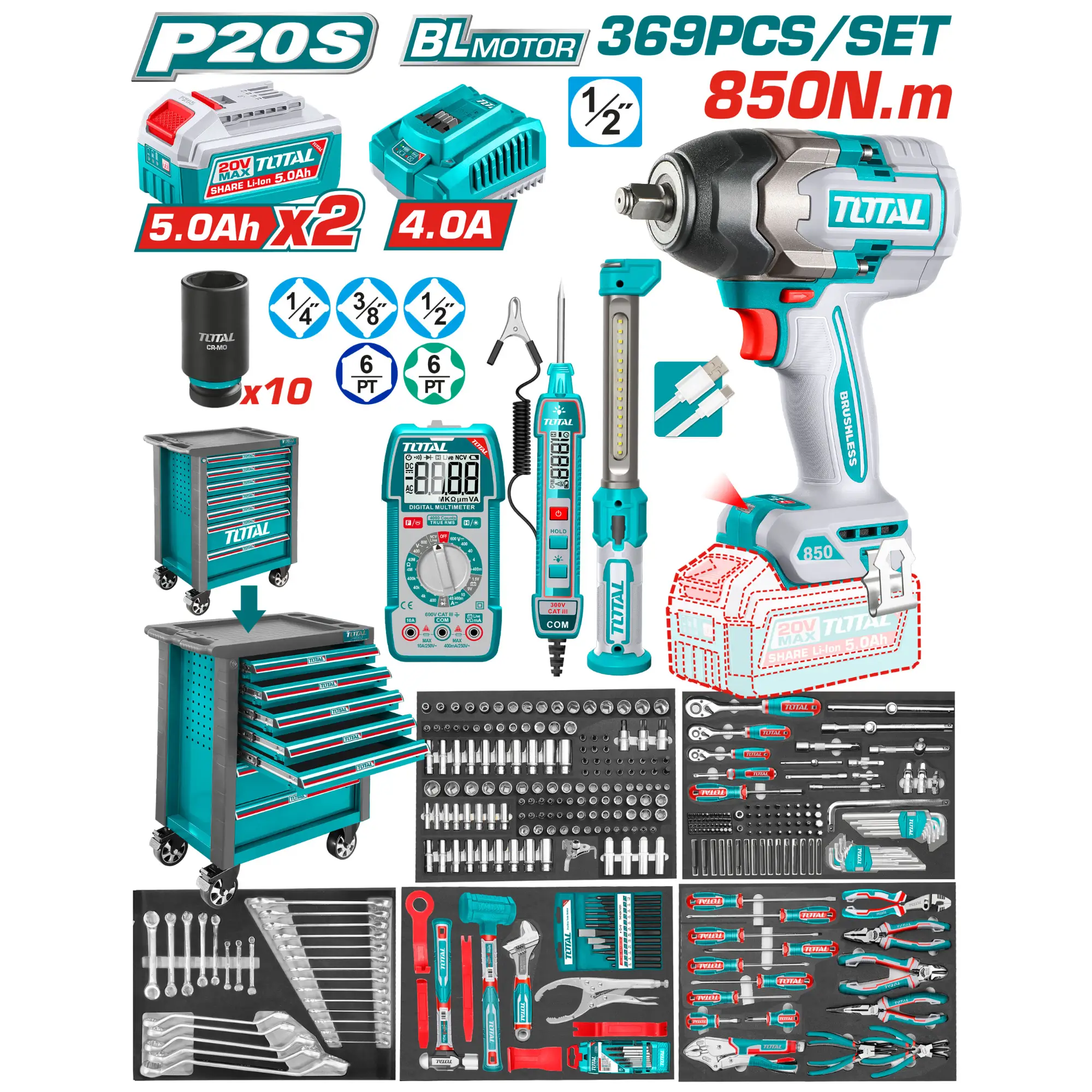 مجموعة صندوق أدوات ٣٦٩ قطعة قطع غيار أدوات ليثيوم أيون: مفتاح ربط صدمي لاسلكي ٨٥٠ نيوتن متر (TIWLI20851): محرك بدون فرش الجهد: ٢٠ فولت محرك مربع: ١/٢ بوصة سرعة الدوران بدون حمل: ٠-١٦٠٠/٠-٢١٠٠/٠-٢٤٠٠ دورة في الدقيقة معدل الدوران: ٠-١٥٠٠/٠-١٨٠٠/٠-٢٢٠٠ نبضة في الدقيقة عزم التثبيت: ٨٥٠ نيوتن متر عزم فك الصواميل: ١٠٠٠ نيوتن متر مصباح عمل LED مدمج المحتويات: بطاريتان ٥.٠ أمبير/ساعة (TFBLI20531) شاحن ٤ أمبير (TFCLI20411) فولتية الشحن: ٢٢٠-٢٤٠ فولت ~ ٥٠/٦٠ هرتز ١٠ رؤوس مفكات صدمية بعمق ١/٢ بوصة: ١٠، ١٢، ١٣، ١٤، ١٥، ١٧، ١٩، ٢١، ٢٢، ٢٤ مصباح عمل واحد (TWLI043006) جهاز اختبار سيارة واحد (مع بطاريتين) (THTS41001) مقياس متعدد رقمي واحد (مع بطاريتين) (TMT536002) أجزاء الصندوق: مع ٧ أدراج الحجم الكلي: ٧٦٥ × ٤٦٥ × ٨١٢ مم الحجم الكلي مع العجلات: ٧٦٥ × ٤٦٥ × ٩٧٦ مم حجم العجلات: ٥ بوصة × ٢ بوصة سمك الخزانة: ٠.٨-١.٠ مم سمك الدرج: ٠.٧ مم مع ٥ أدراج بأبعاد ٥٣٦ × ٤١٠ × ٧٤.٥ مم مع درجين بأبعاد ٥٣٦ × ٤١٠ × ١٥٣.٥ مم ٥ خطافات حديدية (لتعليق الأدوات) مغلفة في إسفنج EVA + علبة كرتون + منصة نقالة أجزاء الأدوات: مفتاح ربط سقاطة واحد: 1/4 بوصة، 72 سنًا 23 قطعة بت سقاطة 1/4 بوصة × 32 (طول) المقبس: سداسي: 3، 4، 5، 6، 8، 10 مم شكل النجمة: T8، T10، T15، T20، T25، T27، T30، T40 SL: 4، SL5.5، SL6.5، PH1، PH2، PH3، PZ1، PZ2، PZ3. ١٣ قطعة مقبس ١/٤ بوصة، ٤ مم، ٤.٥ مم، ٥ مم، ٥.٥ مم، ٦ مم، ٧ مم، ٨ مم، ٩ مم، ١٠ مم، ١١ مم، ١٢ مم، ١٣ مم، ١٤ ١٠ قطع مقبس ١/٤ بوصة، عمق ٥٠ مم (طول): ٤ مم، ٥ مم، ٦ مم، ٧ مم، ٨ مم، ٩ مم، ١٠ مم، ١١ مم، ١٢ مم، ١٣ مم ٦ قطع مقبس نجمي ١/٤ بوصة: E٤، E٥، E٦، E٧، E٨، E١٠ قطعتان من قضيب تمديد ١/٤ بوصة: ٥٠ مم، ١٠٠ مم قطعة واحدة من مقبض دوار: ١/٤ بوصة × ١٥٠ مم قطعة واحدة من قضيب تمديد مرن: ١/٤ بوصة × ١٥٠ مم قطعة واحدة من وصلة عالمية ١/٤ بوصة قطعة واحدة من قضيب منزلق على شكل حرف “T”: ١/٤ بوصة × ١١٤ مم قطعة واحدة محول ثلاثي الاتجاهات ١/٤ بوصة: ٣/٨ بوصة (F) × ١/٤ بوصة (M) قطعة واحدة من الساق المغناطيسية: ٦.٣٥ مم × ١٠٠ مم قطعة واحدة من حامل اللقم: ١/٤ بوصة × ٦.٣٥ مم ٤٠ قطعة من اللقم بمقاس ٦.٣٥ × ٢٥ مم (L): T5-T6-T7-T8-T9-T10-T15-T20-T25-T30-PH1-PH2-PH2-PH3-PH4-PZ1-PZ2-PZ2-PZ3-PZ4 -SL3-SL3-SL4-SL4-SL5-SL5.5-SL6-SL6.5-SL7-SL7-H2-H3-H3-H4-H4-H5-H5-H6-H7-H7 قطعة واحدة من مفتاح ربط سقاطة: ٣/٨ بوصة، ٧٢ سنًا ١٥ قطعة مقبس بتات 3/8 بوصة × 48 مم (طول): PH1، PH2، PZ1، PZ2، SL3، SL4، SL5، SL6، T10H، T15H، T20H، T25H، T27H، T30H، T40H 13 قطعة مقبس سداسي 3/8 بوصة: 10 مم، 11 مم، 12 مم، 13 مم، 14 مم، 15 مم، 16 مم، 17 مم، 18 مم، 19 مم، 21 مم، 22 مم، 24 مم 10 قطع مقبس سداسي عميق 3/8 بوصة: 8 مم، 10 مم، 11 مم، 12 مم، 13 مم، 14 مم، 15 مم، 16 مم، 17 مم، 19 مم 7 قطع مقبس نجمي 3/8 بوصة: E10، E11، E12، E14، E16، E18، E20 قطعتان قضيب تمديد 3/8 بوصة: 75 مم، 150 مم قطعة واحدة من وصلة عالمية: 3/8 بوصة قطعة واحدة من محول ثلاثي الاتجاهات 3/8 بوصة: 3/8 بوصة (F) × 3/8 بوصة (M) قطعة واحدة من مفتاح ربط سقاطة: 1/2 بوصة، 72 سن قطعة واحدة من وصلة عالمية 1/2 بوصة 19 قطعة من مقبس 1/2 بوصة DR: 8 مم، 10 مم، 11 مم، 12 مم، 13 مم، 14 مم، 15 مم، 16 مم، 17 مم، 18 مم، 19 مم، 20 مم، 21 مم، 22 مم، 23 مم، 24 مم، 27 مم، 30 مم، 32 مم 12 قطعة من مقبس 1/2 بوصة DR بعمق 77 مم (L): 10 مم، 11 مم، 12 مم، 13 مم، 14 مم، 15 مم، 16 مم، 17 مم، 18 مم، 19 مم، 21 مم، 22 مم ٨ قطع من مقابس نجمة ١/٢ بوصة: E١٠، E١٢، E١٤، E١٦، E١٨، E٢٠، E٢٢، E٢٤ قطعتان من مقبس شمعة الإشعال: ١/٢ بوصة، ١٦ مم، ٢١ مم قطعة واحدة من قضيب T منزلق ١/٢ بوصة × ٢٥٠ مم قطعة واحدة من مقبض L ١/٢ بوصة × ٢٥٠ مم قطعتان من مقبض ١/٢ بوصة × ٢٥٠ مم قضيب تمديد: ١٠٠ مم، ٢٥٠ مم ٣ قطع رؤوس مثقاب ١/٢ بوصة × ٥٨ مم (طول) بمقابس: T55، T60، T70 قطعة واحدة من محول ثلاثي الاتجاهات ١/٢ بوصة: ٣/٨ بوصة (عرض) × ١/٢ بوصة (عرض) قطعة واحدة من مفتاح فلتر الزيت قطعة واحدة من حامل الرؤوس: ١/٢ بوصة × ٨ مم ٣٢ قطعة رؤوس مثقاب ٨ × ٣٠ مم (طول) بمقابس: PH3، PH4، PZ3، PZ4، H7، H8، H10، H12، H14، SL5، SL6، SL6.5، SL8، T20، T25، T27، T30، T35، T40، T45، T50، T55، T27H، T30H، T35H، T40H، T45H، T50H، M5، M6، M8، M10 ٢٢ قطعة ٨ رؤوس مفكات براغي (طولية): PH1، PH2، PH3، SL5.5، SL6.5، H6، H7، H8، H10، H12، T20، T30، T40، T45، T50، T55 ٨ ق