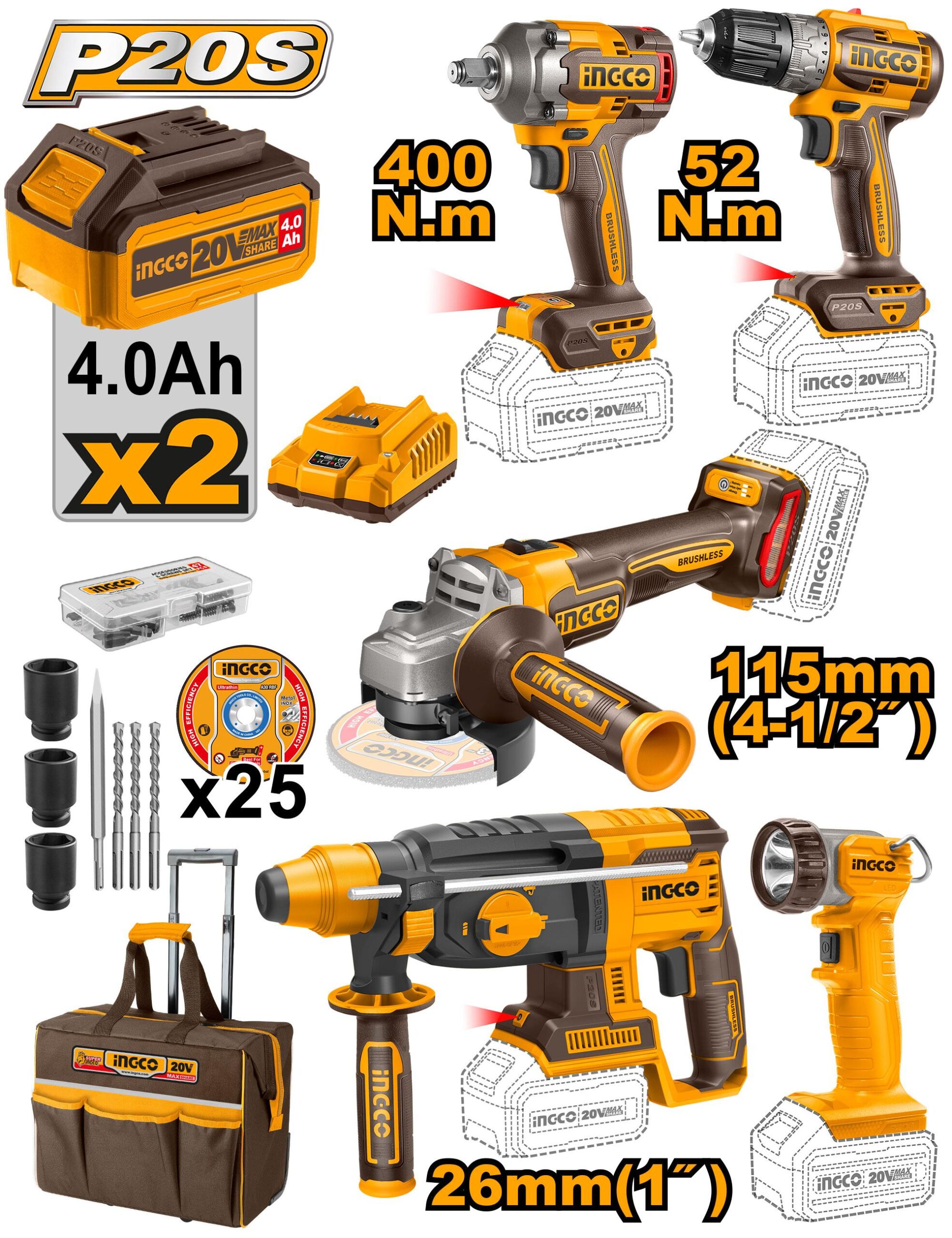 طقم كومبو بطارية 5 قطع 2 بطارية و شنطة ترولي انكو – CKLI2058